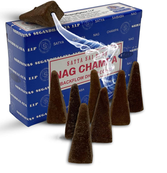 Satya Sai Baba Nagchampa is an oriental & floral combination of Sandalwood, Champaca, Frangipani & Magnolia. These backflow Dhoop cones when lit produce the smoke in reverse direction, i.e. top to bottom creating a beautiful waterfall smoke effect. Each cone is dry and has a hole at the bottom, which acts as an outlet for the smoke. To have a perfect ornamental effects, please burn the incense cones in windless conditions. It helps people to calm & have a warming effect while meditation. It also acts as a room freshner once burnt thereby purifying any envoirnment & naturally clearing out any negative energy & filling it with possitive vibrations.
