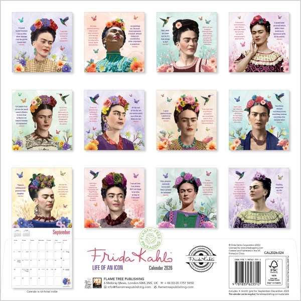 Mexican artist Frida Kahlo sought to define her identity, as well as that of Mexico. She explored themes of self-identity, gender, postcolonialism and popular culture from Mexico throughout her works. Now regarded as a feminist and LGBT icon, as well as a key artist during the twentieth century, this calendar celebrates Frida Kahlo?s life with beautiful portraits. Informative text accompanies each work and the datepad features previous and next months views. Printed on FSC-certified paper, with plastic-free packaging.