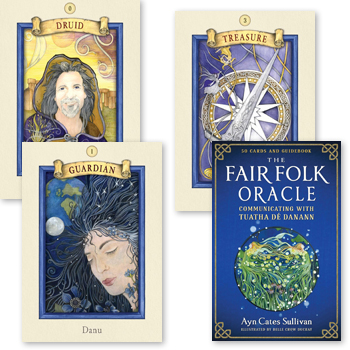 The deck features Danu, the mother of the Tuatha Dé Danann; Macha, the shapeshifting goddess who ruled as a High King of Ireland; The Dagda, benevolent chief god associated with fertility, wisdom and magic; and the romantic Aengus Og who presides over youth and poetry. The Faery cards include a Gnome who tends roots, dancing Undines, Sylphs and flower spirits.