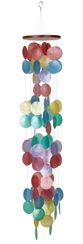 Capiz are farmed in Indonesia and every bit is used. The pieces are carefully sorted, dried, sliced, shaped, sanded and dyed. Strung together with strong, invisible nylon cord, the thin, flat translucent pieces provide luminous color. In the 1500s, capiz were used as windowpanes in houses; now they are used in all sorts of home decorations, including lampshades and vases and (of course) windchimes!