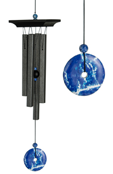 The enchanting sound of this chime is the result of a special tuning using the "golden ratio." This ratio, discovered by the ancient Greeks, can be found throughout nature. Lapis, also called lapislazuli, is a beautiful blue-colored stone often found with veins of white marble. The ancient Egyptians used lapis to represent heaven. They made amulets, ornaments and even ground it to be used as eye shadow. This shade of blue is the color of inspiration, sincerity and spirituality. We blended blue stone beads with a faux lapis windcatcher to create our beautiful Blue Lapis Chime.