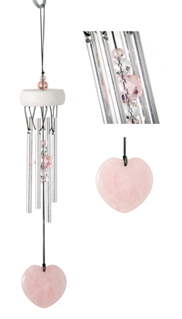 The Rose Quartz Heart Chime combines clear and pink crystals with a genuine hand-carved stone windcatcher. The result is a vibrant windchime that plays a lovely soft song. Rose quartz is the stone of universal love and symbolizes compassion and calmness.