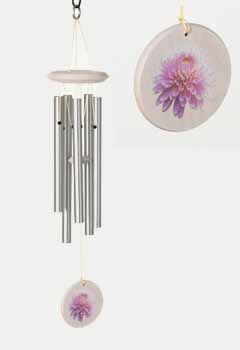 Bring the beauty of nature to your outdoor space with this eye-catching Flower Chime from Woodstock Chimes. Crafted from aluminum and silver with washed white wood, it features a charming floral graphic on the feather. But the real magic begins when a gentle breeze blows through, setting the hand-tuned aluminum tubes dancing. Listen closely and you'll hear delightful, random melodies in a soothing pentatonic scale. Perfect for hanging from a covered patio, front porch, or in your garden, this Pink Mum Flower Chime lends an upscale, decorative touch while providing the calming sounds of nature's symphony. Let it be a reminder to slow down and enjoy life's simple pleasures.