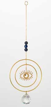 Add a touch of mystical charm to your space with this captivating Evil Eye suncatcher. Featuring a striking gold-tone design, the piece includes two concentric rings that frame a modern cut-out Evil Eye symbol at the center. Suspended below is a faceted crystal prism that catches and reflects light beautifully, creating mesmerizing rainbows when placed near a sunny window. The suncatcher is adorned with deep blue gemstone beads (resembling lapis lazuli) along a delicate gold chain, adding a sense of tranquility and protection. Perfect for home decor, spiritual settings, or gifting, this piece combines beauty with a meaningful symbol of good fortune and warding off negativity.