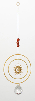Illuminate your space with the brilliance of this radiant sun suncatcher. At its center, a striking sun hangs elegantly within concentric gold-tone rings, embodying celestial charm and timeless elegance. A faceted crystal prism dangles below, catching sunlight to scatter vibrant rainbows across your room. The suncatcher is accented with three red stone beads, suspended along a delicate gold chain. Perfect for brightening windows, enhancing sacred spaces, or as a thoughtful gift, this piece brings a touch of cosmic wonder and uplifting energy to any setting.