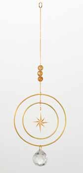 Illuminate your space with the brilliance of this radiant star suncatcher. At its center, a striking eight-pointed star hangs elegantly within concentric gold-tone rings, embodying celestial charm and timeless elegance. A faceted crystal prism dangles below, catching sunlight to scatter vibrant rainbows across your room. The suncatcher is accented with three golden stone beads, suspended along a delicate gold chain. Perfect for brightening windows, enhancing sacred spaces, or as a thoughtful gift, this piece brings a touch of cosmic wonder and uplifting energy to any setting.