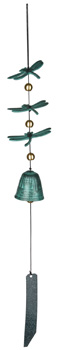 The Dragonfly Windbell presents three clever dragonflies hovering above a delicate flower bell. Cast brass and cast aluminum.