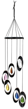 These six crisp, clean sounding bells each have a different, eloquent, coloured glass accent to add a touch of whimsy to their sophisticated look. The black aluminum rings' silver edging defines an orbit around the colorful crystal centres.